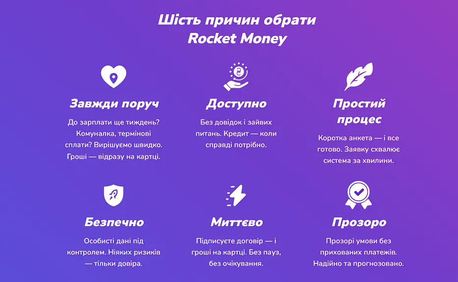 Rocket Money - сучасний український онлайн-сервіс швидкого кредитування, створений для вашої зручності. Оформіть позику за кілька хвилин без зайвих документів та черг - все онлайн, автоматично, цілодобово. Гроші надходять прямо на вашу банківську карту, коли це дійсно потрібно.