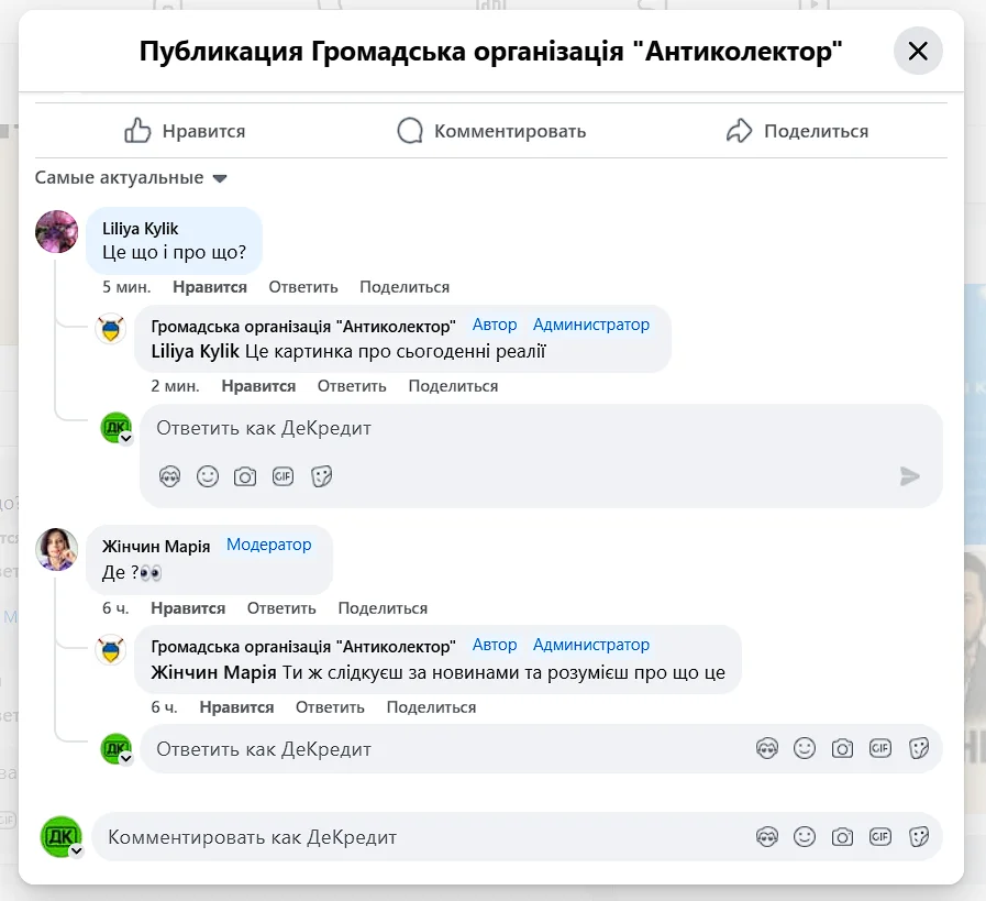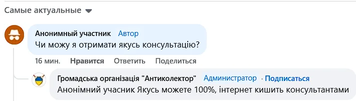 Порекомендувала цю організацію подруга, дала посилання. Я вступила в групу. Багато читала, переглядала різні дописи, публікації, підписалася на ютуб-канал. Потім розмістила свій допис з питанням про МФО, мені там відповіли, наче все нормально, але там був скріншот, де мої персональні дані (я їх не затерла випадково) і я видалила той допис. І мене в той же день вигнали з групи і заблокували. Неадеквати.